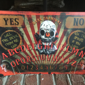 I designed this Creepy Clown Ouija Board and am offering a few 11x17 inch poster prints. It sports the creepy clown circus conductor. The circles say "Ask if you dare" and "Draw the devil from his lair", The colors are orange, yellow and black for the Wicked Carnival. He has the word Wicked on his forehead so carnival goers beware.